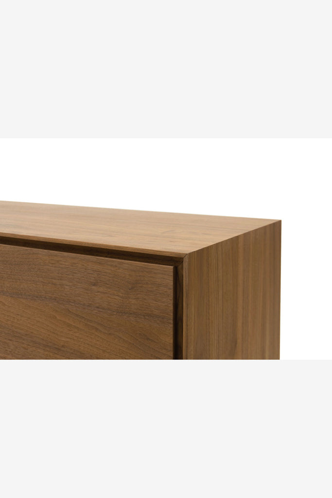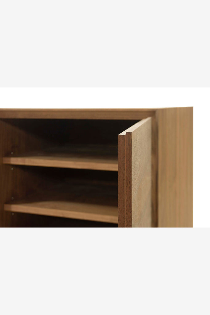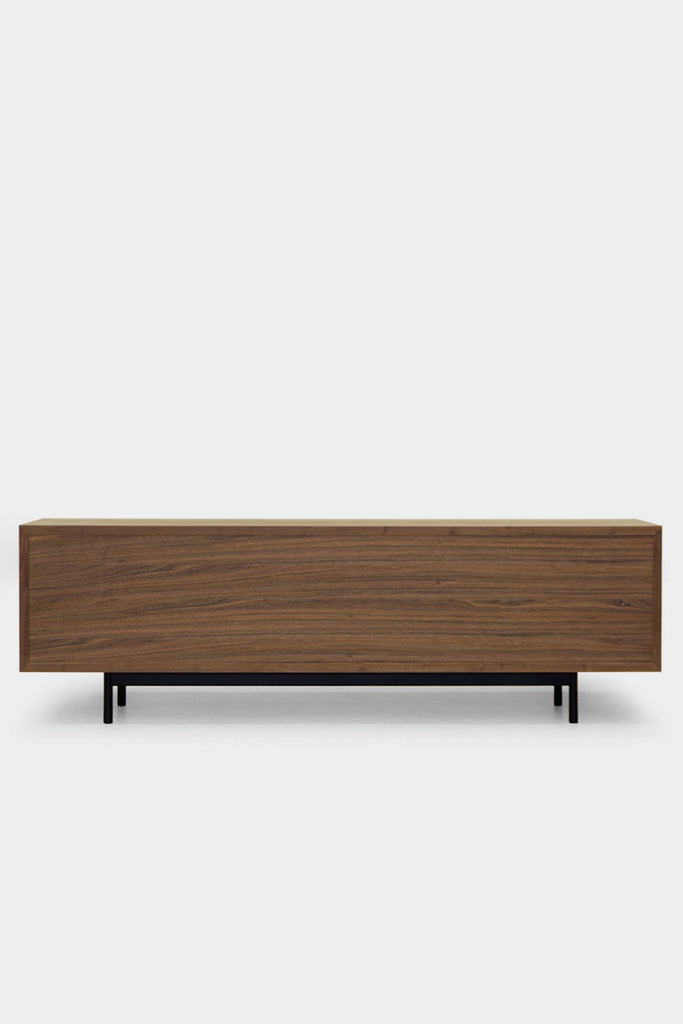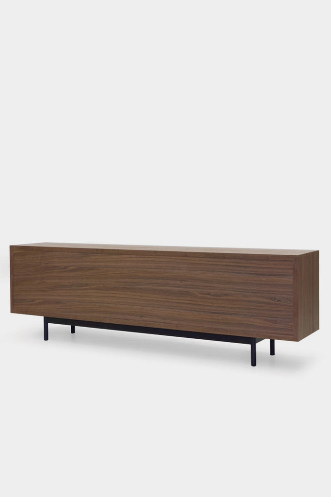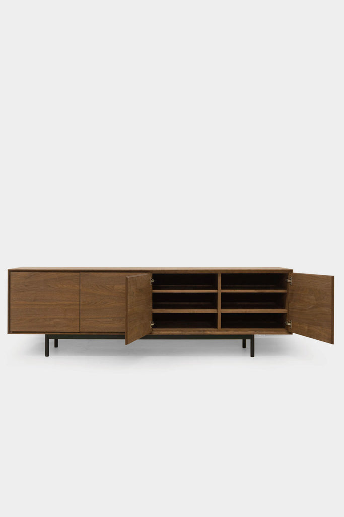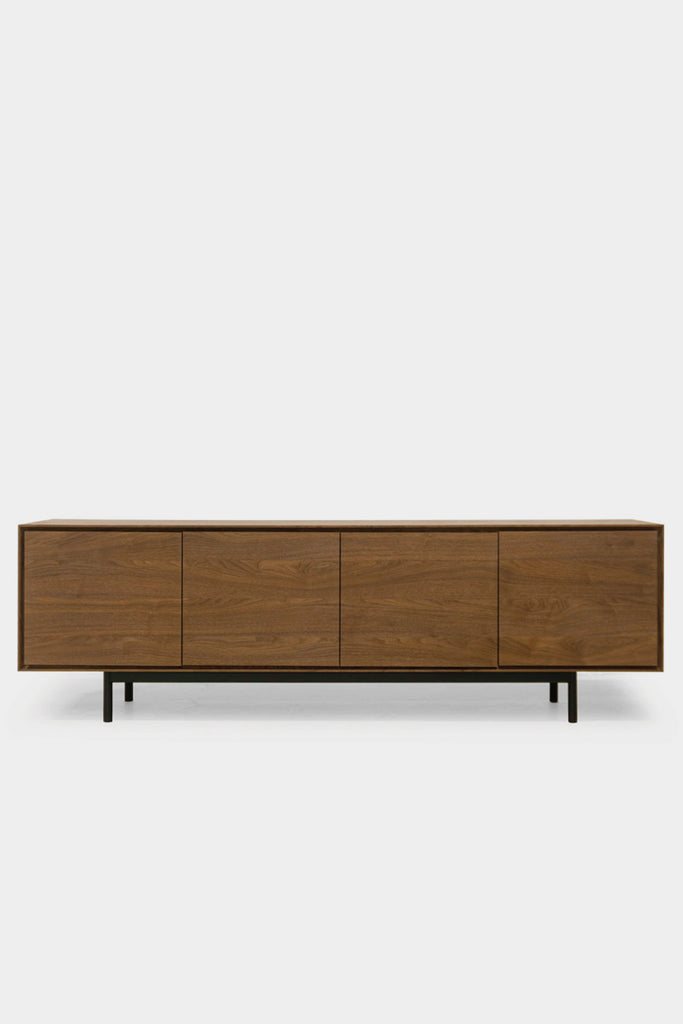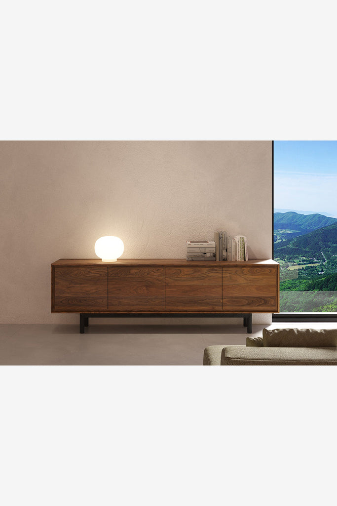 木質を活かした存在感のあるリビングボード。本体のボリュームとシンプルで細身の脚部のコントラストが空間に軽やかさを与えます。