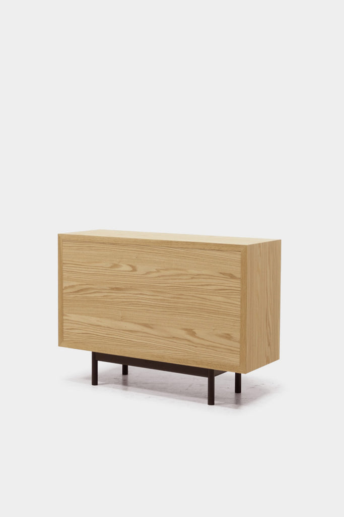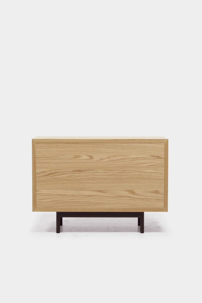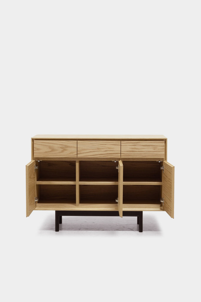 リビングやダイニング、キッチンスペースなど、様々な場所に配置しても違和感を感じさせない佇まいのサイドボード。シャープな直線的なラインと、円柱形状の脚、前面の木目が空間にモダンながら優しさを感じるデザインです。上部は引出し、下部は扉仕様となっていて、シーンに応じて様々なものが収納できます。