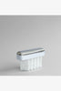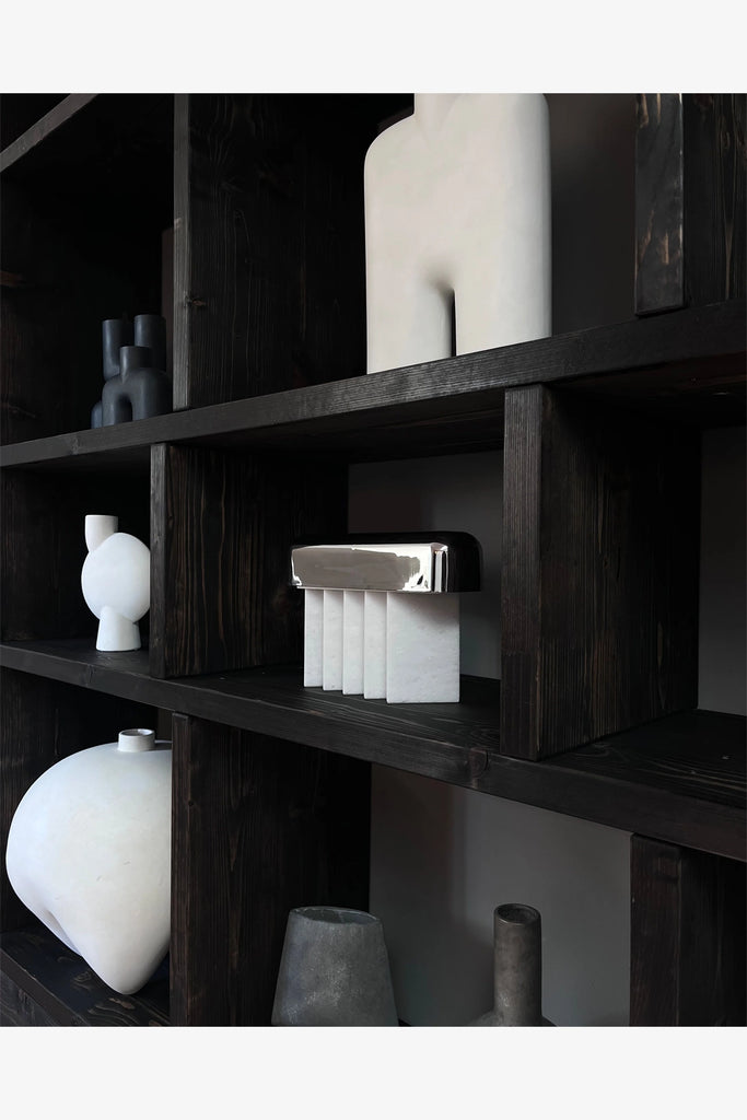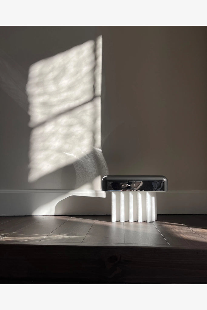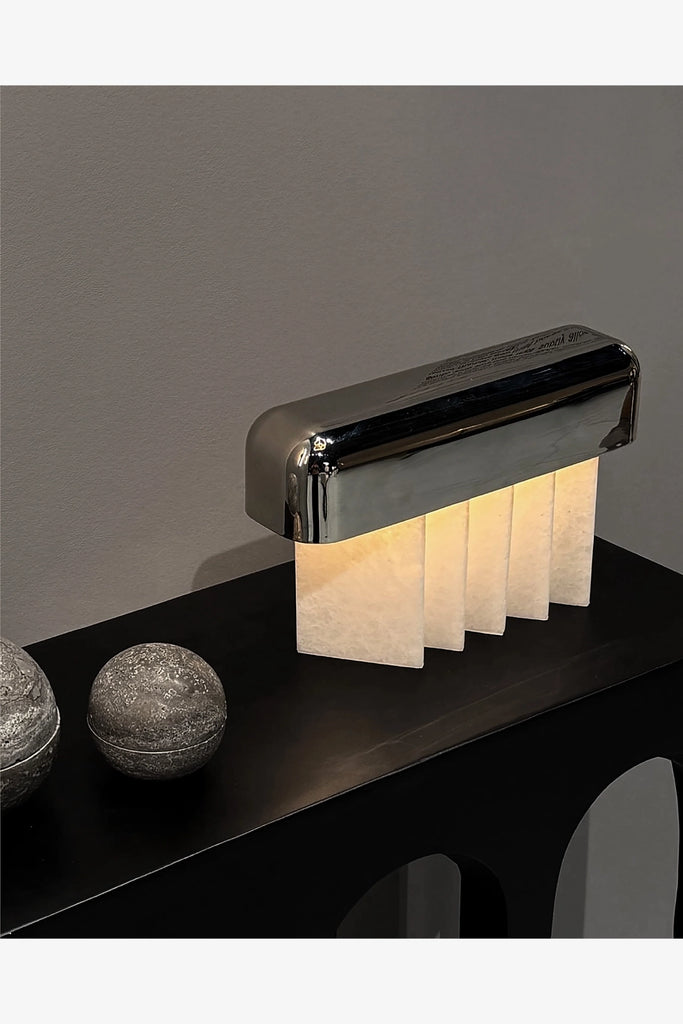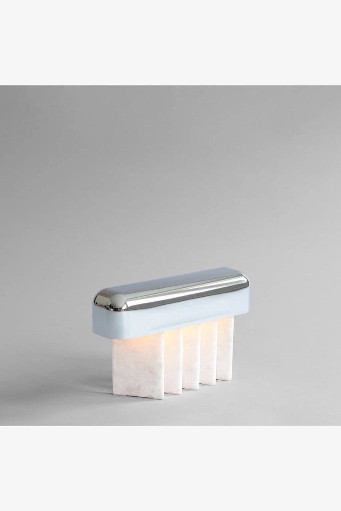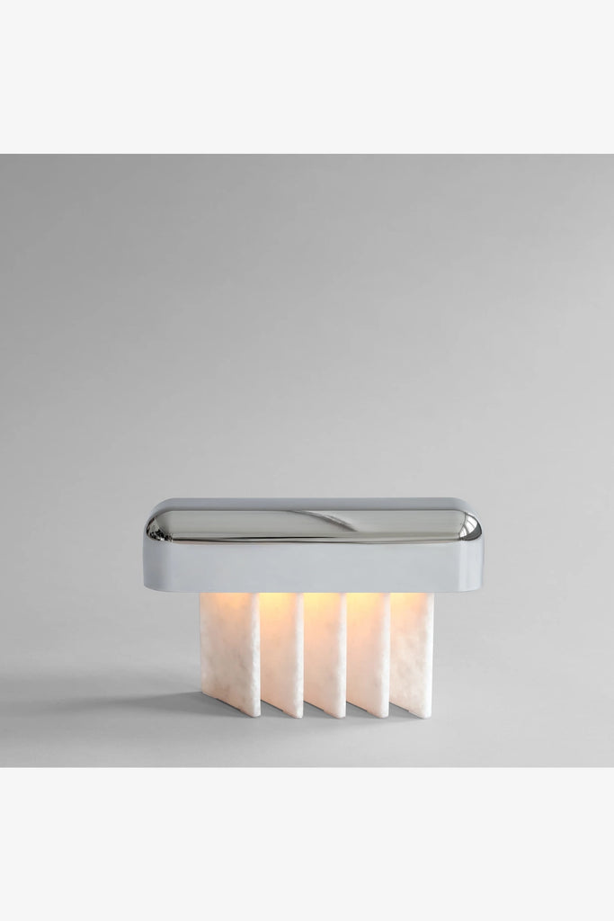 特徴的なデザインは、ミラークローム仕上げの曲線を描くメタルランプシェードが、5本の長方形の大理石の脚の上に優雅に載っています。独特な結晶化した大理石で作られたこれらの脚は、さりげなく光を透過し、温かみのある落ち着いた光を放ち、空間に心地よい雰囲気をもたらします。ランプシェードの内側には、色温度2400KのLEDライトが内蔵されており、空間を優しく照らし、ビートルの魅力をさらに引き立てます。 多用途性を重視して設計されたビートルは、充電式バッテリーと3段階の調光機能を備え、持ち運びも簡単で、お好みの雰囲気に調整できます。持ち運びが簡単なため、本棚に置いたり、窓辺に置いたり、さまざまな場所に移動させて心地よい光を放ったりと、家の様々な空間に最適です。