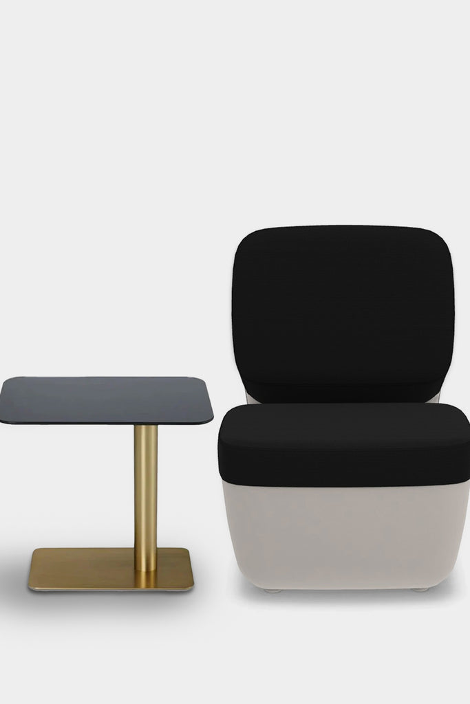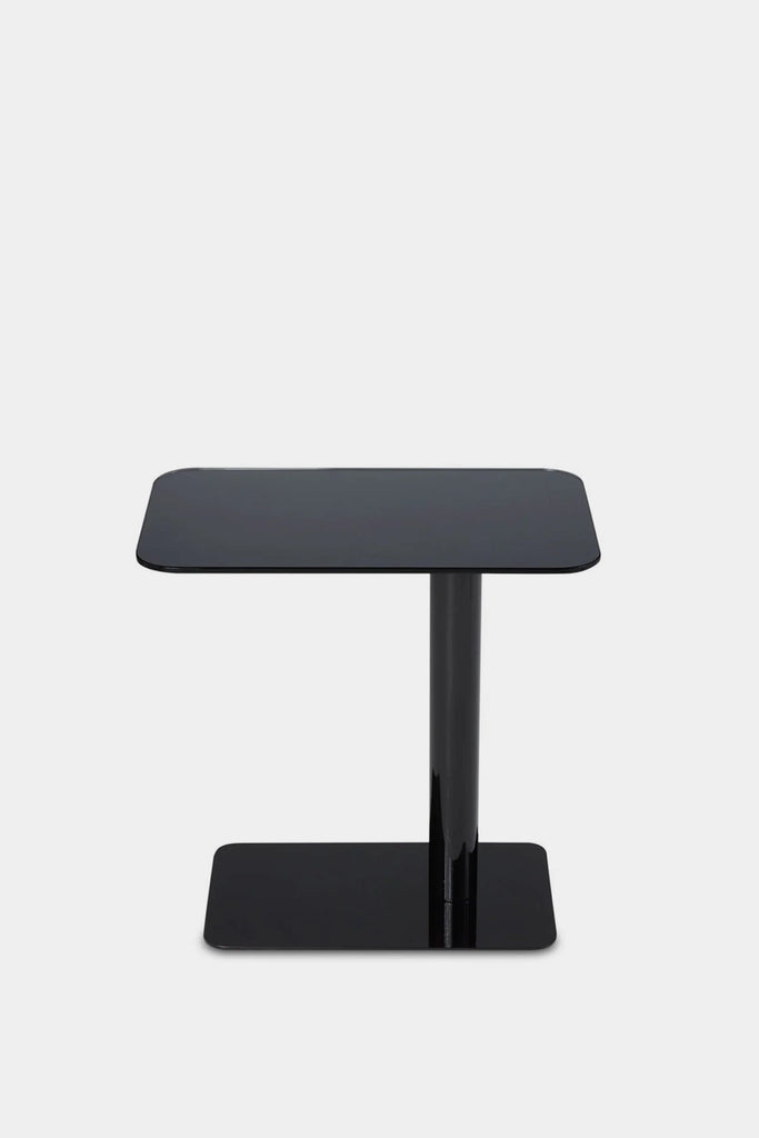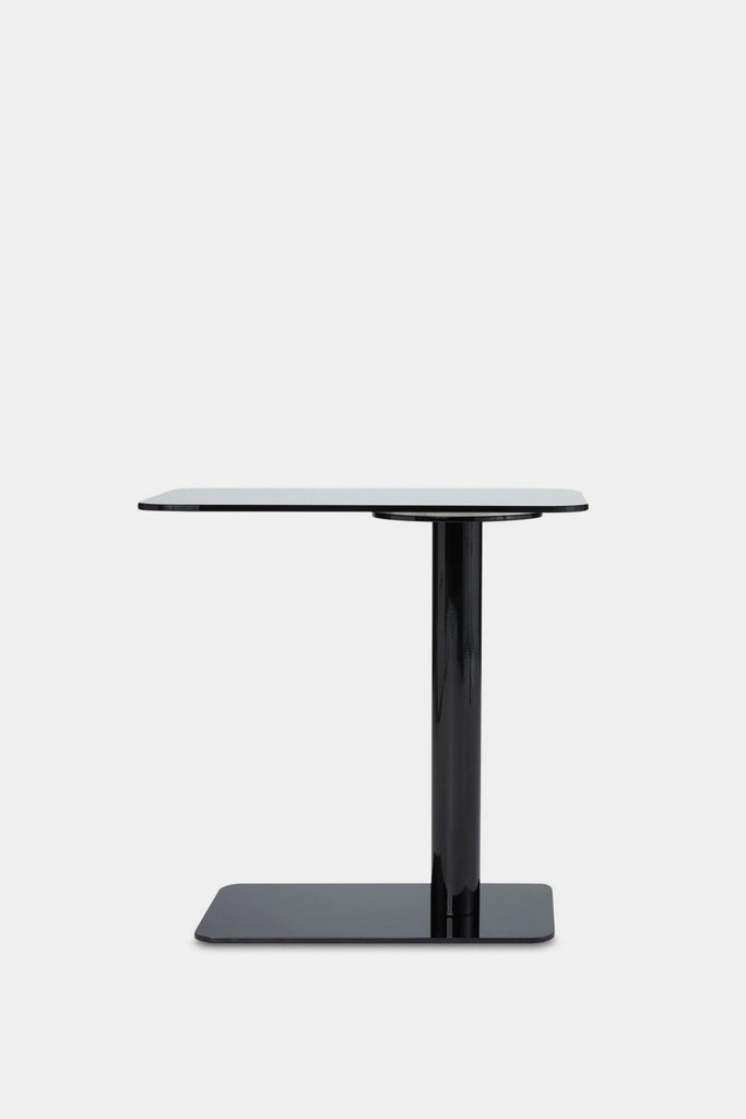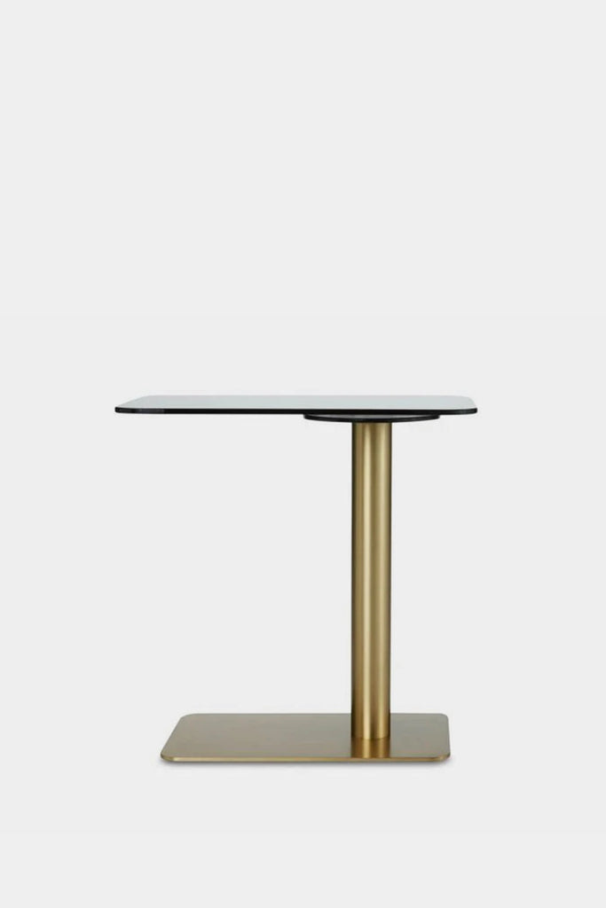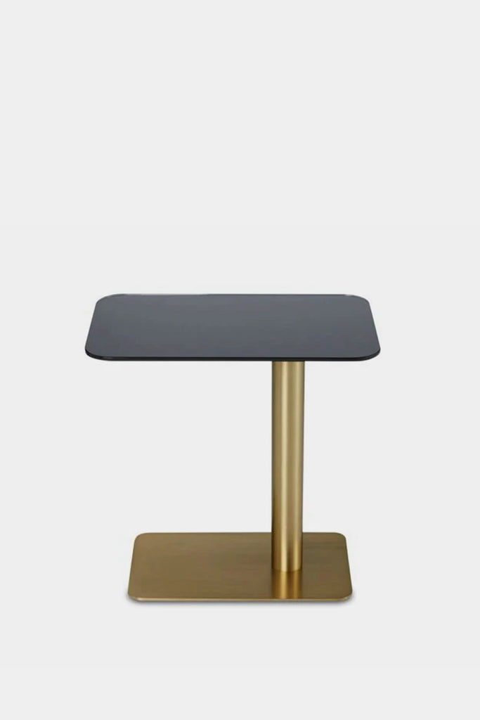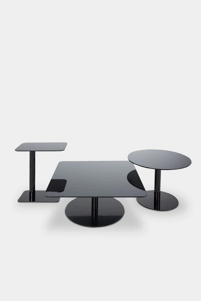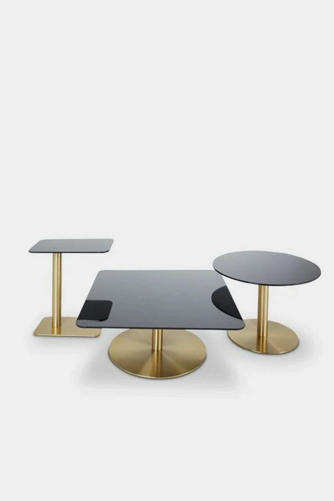 ブラス(真鍮色)、グロッシー・ブラックと2種類のベース(脚)のバリエーションと鏡面加工された3種類のガラス天板で構成されています。