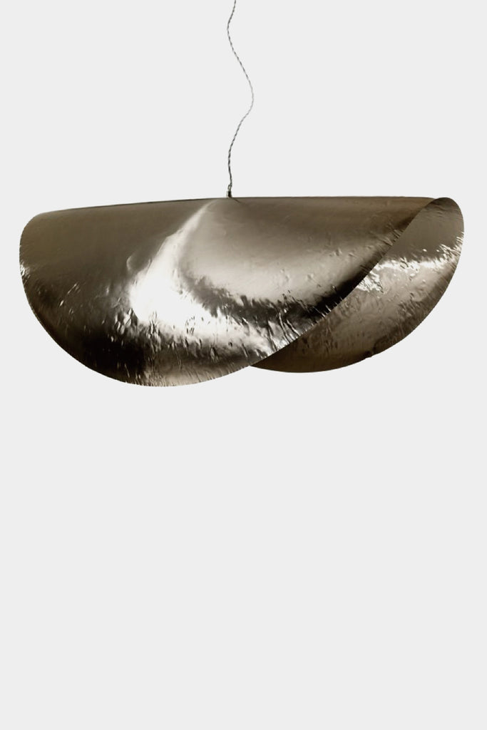 SILVERは、薄く叩いて伸ばされたニッケルメッキ真鍮が、自重により1点1点微妙に異なる形状をつくるユニークなペンダントライト。