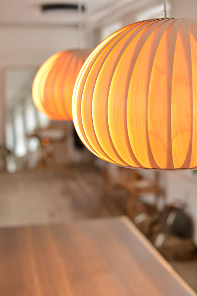 Tom Rossau(トム・ロッサウ)が作り出すランプは、素材の持つ自然な表情に光と影が織りなす彫刻的な表現を加えるという彼独自のアイディアによってデザインされています。構造体そのものがとても温かみのある光を放ち、バーチ材の各シートが重なった部分にできる陰影による深みのある光を醸し出すことにあります。